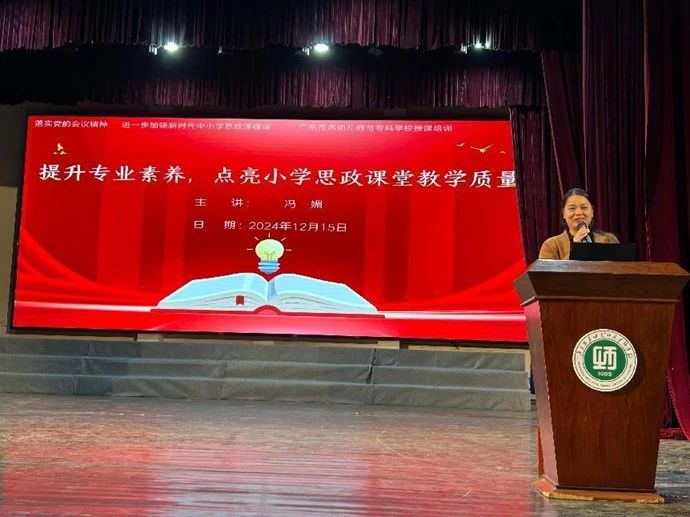 活动伊始,文学院兼职副教授、高州市第八小学党支部书记兼校长冯媚老师带来了一场以“提升专业素养,点亮小学思政课教学质量”为主题的精彩讲座。冯媚老师结合自身丰富的教学经验,指出思政课在当下教育中的重要性。她提到,随着教育政策的变化,师范生未来可能不仅要担任语文老师,还需兼任思政等多学科教学,因此要注重培养多种技能,以适应教学岗位的多样化需求。