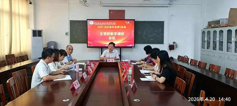 根据学校教务部的《关于深入二级学院开展教学调研服务活动的通知》的工作安排, 2026420日下午,文学院在高州校区教学楼401会议室召开教学调研专题工作会议。学校党委委员、副校长吴东,教务部部长黎雪琼,教务部周良勇老师出席会议,会议分两个阶段进行,第一阶段由文学院党总支部书记苏文胜主持、第二阶段由行政负责人田飞主持。