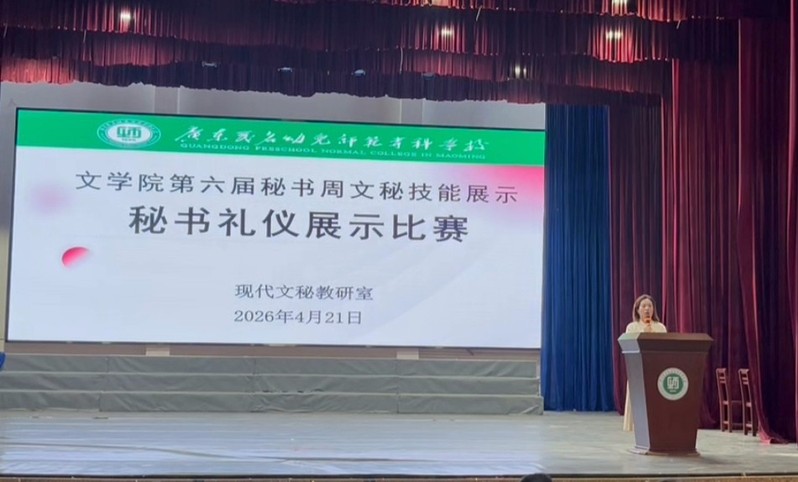 2026 年 4 月 16 日至 23 日,广东茂名幼儿师范专科学校文学院现代文秘教研室,在学校会堂、师训楼成功举办第六届秘书周现代文秘专业技能展示系列活动。本次活动以 “文秘技能展风采,突显青春正能量” 为主题,设打字、方案策划、秘书礼仪展示三项赛事,200 余人次参与,充分展现了文秘学子扎实的专业功底与昂扬的青春风貌。